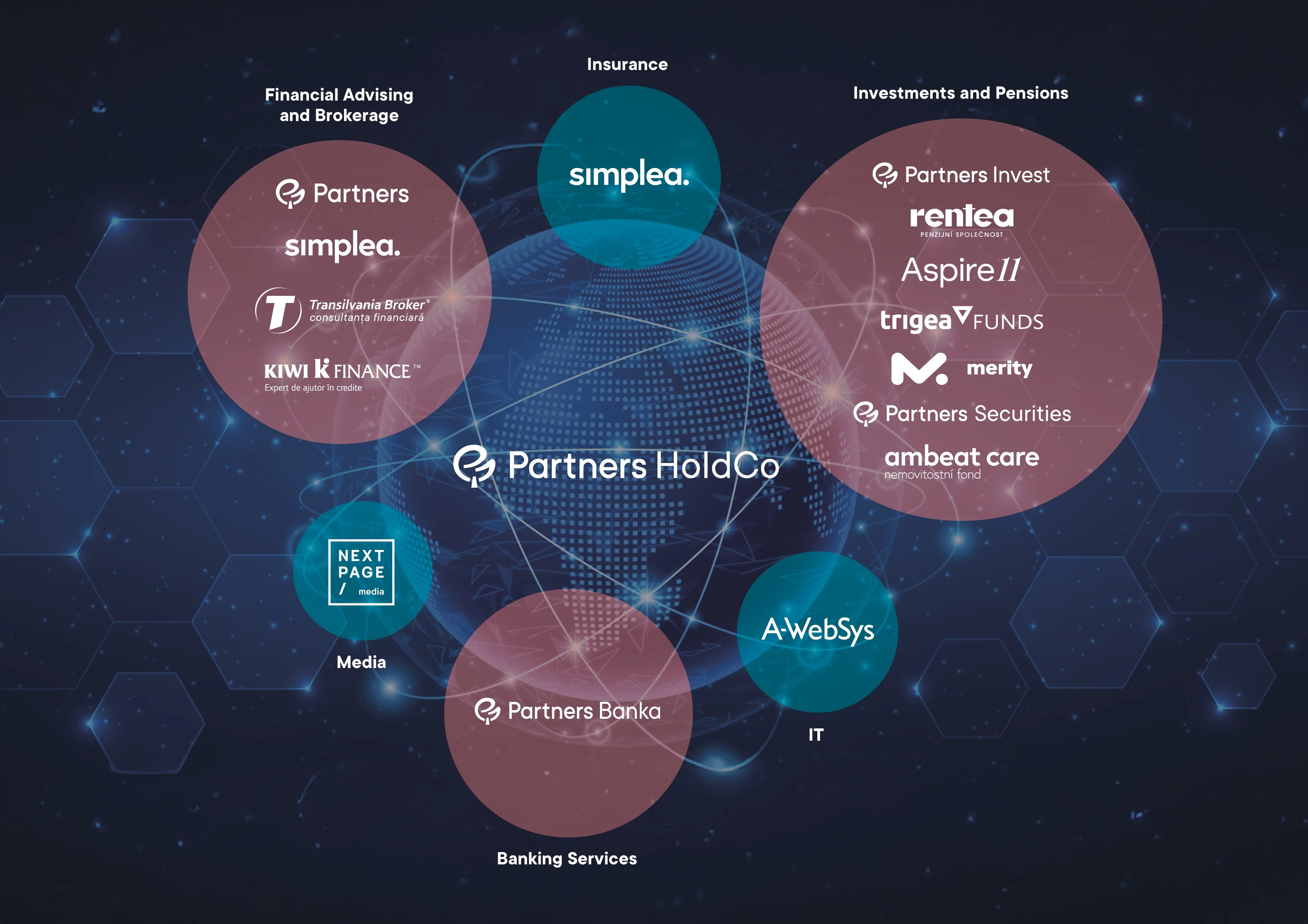 Naše finanční skupina zahrnuje různé společnosti. Základ tvoří Partners Financial Services, a.s., největší nezávislá finančně poradenská společnost v ČR. K té v roce 2011 přibyla investiční společnost Partners Invest, dále pak životní pojišťovny Simplea, penzijní společnost Rentea, nemovitostní fond Trigea a pro kvalifikované investory nemovitostní fond Merity.